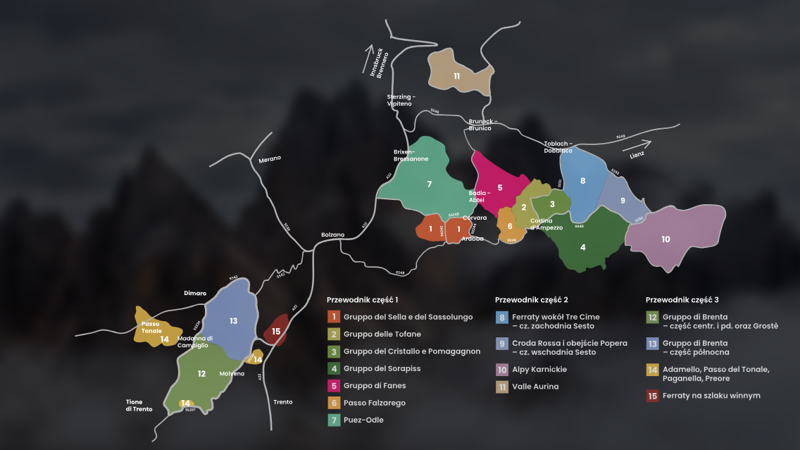 Jeśli szukasz ferraty w konkretnej części Dolomitów, wystarczy kliknąć na region w mapie szlaków Dolomitów, aby przejść do szczegółowego opisu i zobaczyć, jakie możliwości oferuje dany obszar.