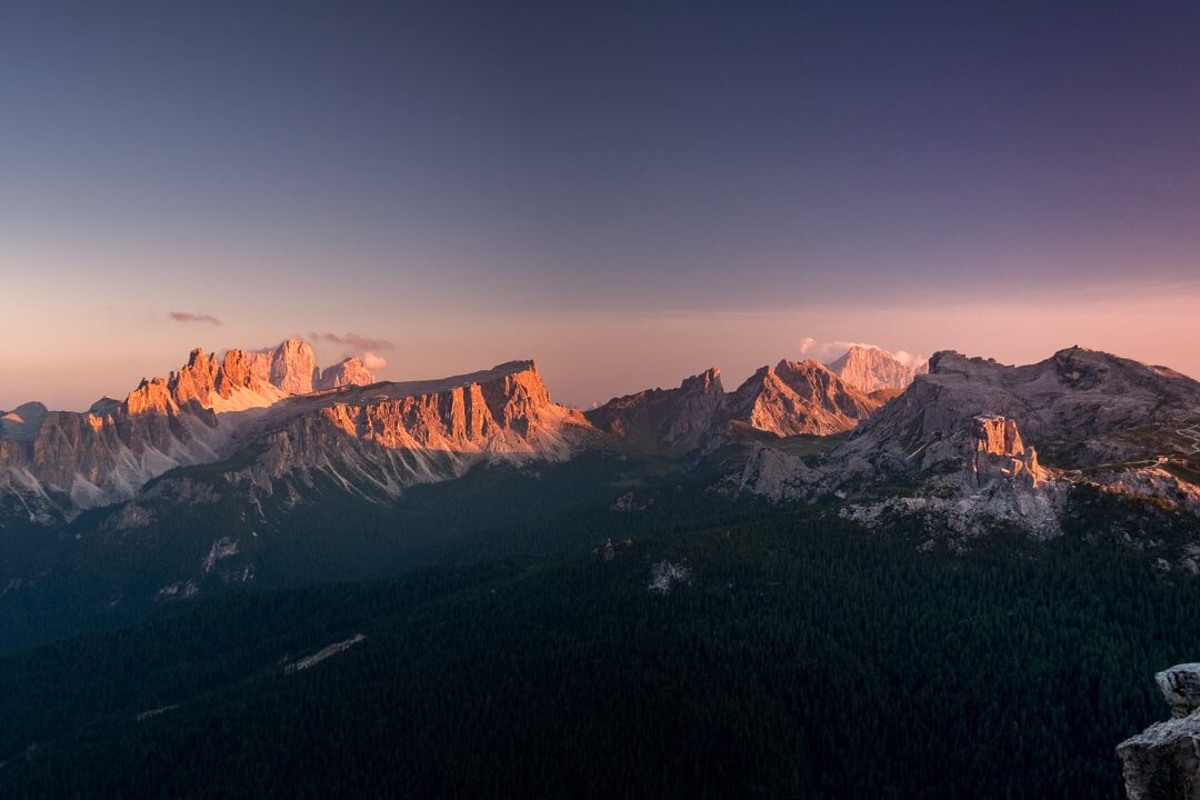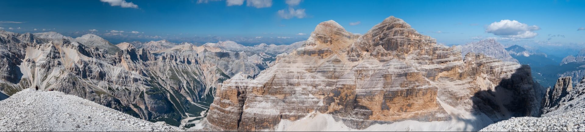 Widok ze szczytu Tofana di Rozes. Górujące nad okolicznymi szczytami Tofana di Mezzo i Tofana di Dentro wygrzewają się w popołudniowym słońcu