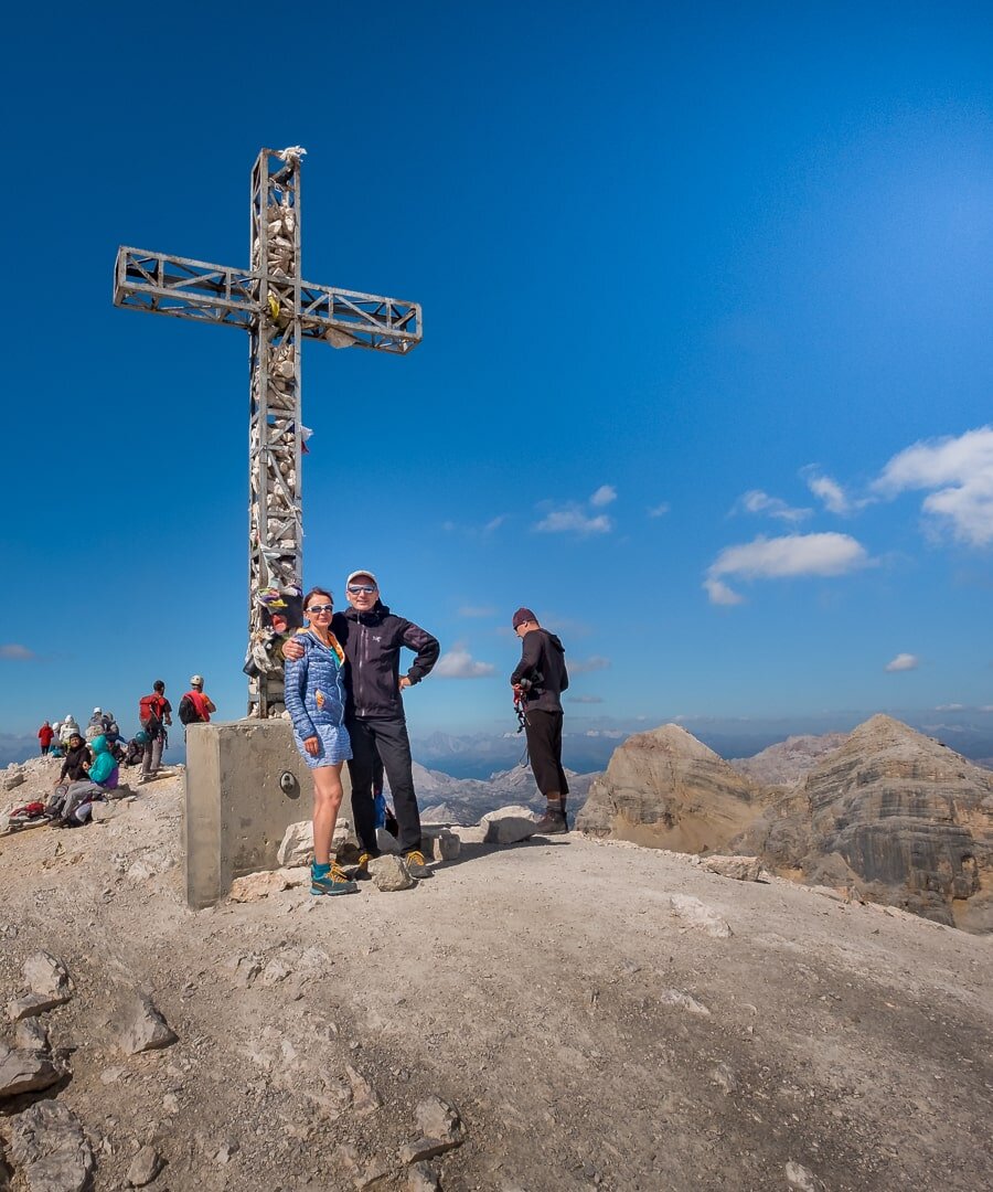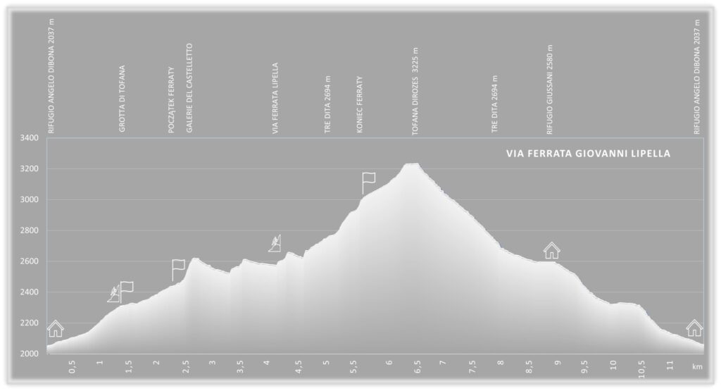 Via ferrata Giovanni Lipella rozpoczyna się wspinaczką po kilku klamrach i krótkich drabin pamiętających na pewno lata sześćdziesiąte. Miejsce wygląda na jeden wielki bałagan z drewna i żelaza (stan na rok 2018), ale niech was to nie zniechęca, dalej będzie już tylko lepiej i jeszcze lepiej. Wchodzimy do tunelu (prawie 500-metrowego) i po metalowych schodach pniemy się w górę. Konieczne są latarki. Przed ostatnim odcinkiem wykuto dwa otwory dające trochę światła w mroku, przez które można wyjść na zewnątrz, na ścieżkę umożliwiającą obejście końcówki tunelu i kilku ostatnich stopni prowadzących w górę oraz już po wyjściu krótkiego ubezpieczonego zejścia. Obie drogi po chwili spotykają się na szerokiej półce, którą już bez ubezpieczenia dochodzimy do drugiej części ferraty. Kolejnymi półkami, trawersując górę cały czas w kierunku północnym, wspinamy się do bardzo charakterystycznej formacji skalnej składającej się z trzech niewielkich turni – to słynna Tre Dita (2694 m). W tym miejscu możemy w razie niepogody odejść ze szlaku w stronę schroniska Giussani. Trasa Ferraty Lipella skręca w prawo na kolejną półkę. Tym razem kierujemy się na południe, do ostatniego, niezwykle widowiskowego, miejsca wyglądającego jak wielki skalny cyrk. Bardzo eksponowaną trasą wchodzimy pod północną grań Tofany na wysokości 3027 m. Teraz zostaje już tylko łatwe podejście ścieżką pod krzyż na szczycie. Widok jest jedyny w swoim rodzaju (wiemy, prawie na każdym szczycie zachwycamy się tak samo, ale tu naprawdę jest pięknie).