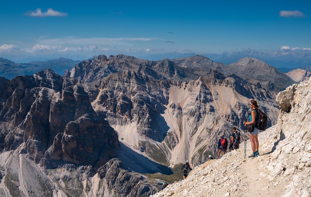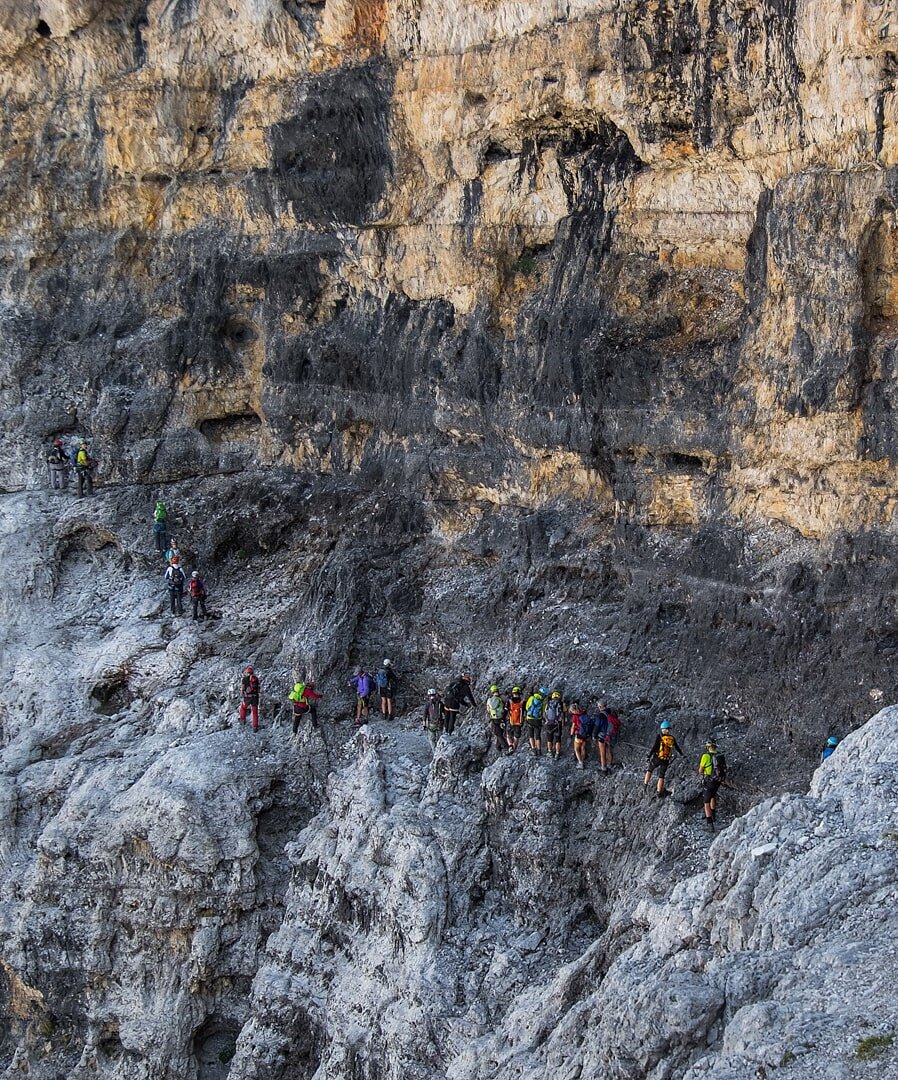 Piękne, imponujące tarasy na ostatnich metrach wspinaczki na trasie Ferraty Lipella. Dalej droga prowadzi łatwą ścieżką. W tle po przeciwnej stronnie skalnego cyrku widać mozolnie podchodzących w górę innych miłośników ferrat