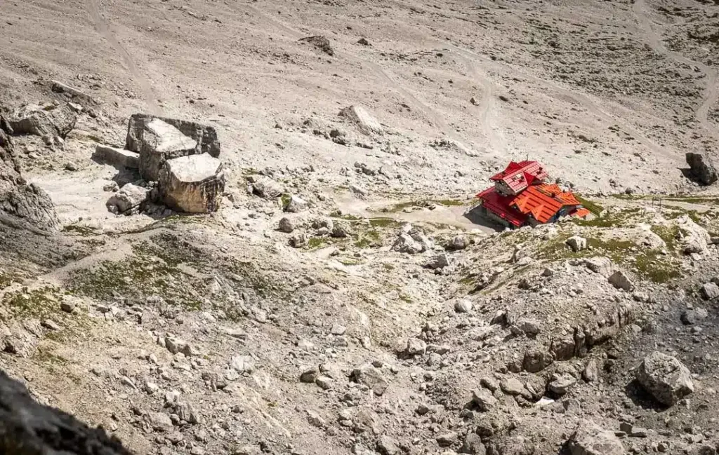 Z przełęczy ruszamy szlakiem 321 w dół w stronę widocznego w oddali Rifugio XII Apostoli, gdzie meldujemy się po godzinnej wędrówce. Pierwsze 20 metrów zejścia jest strome i miejscami ubezpieczone (A).