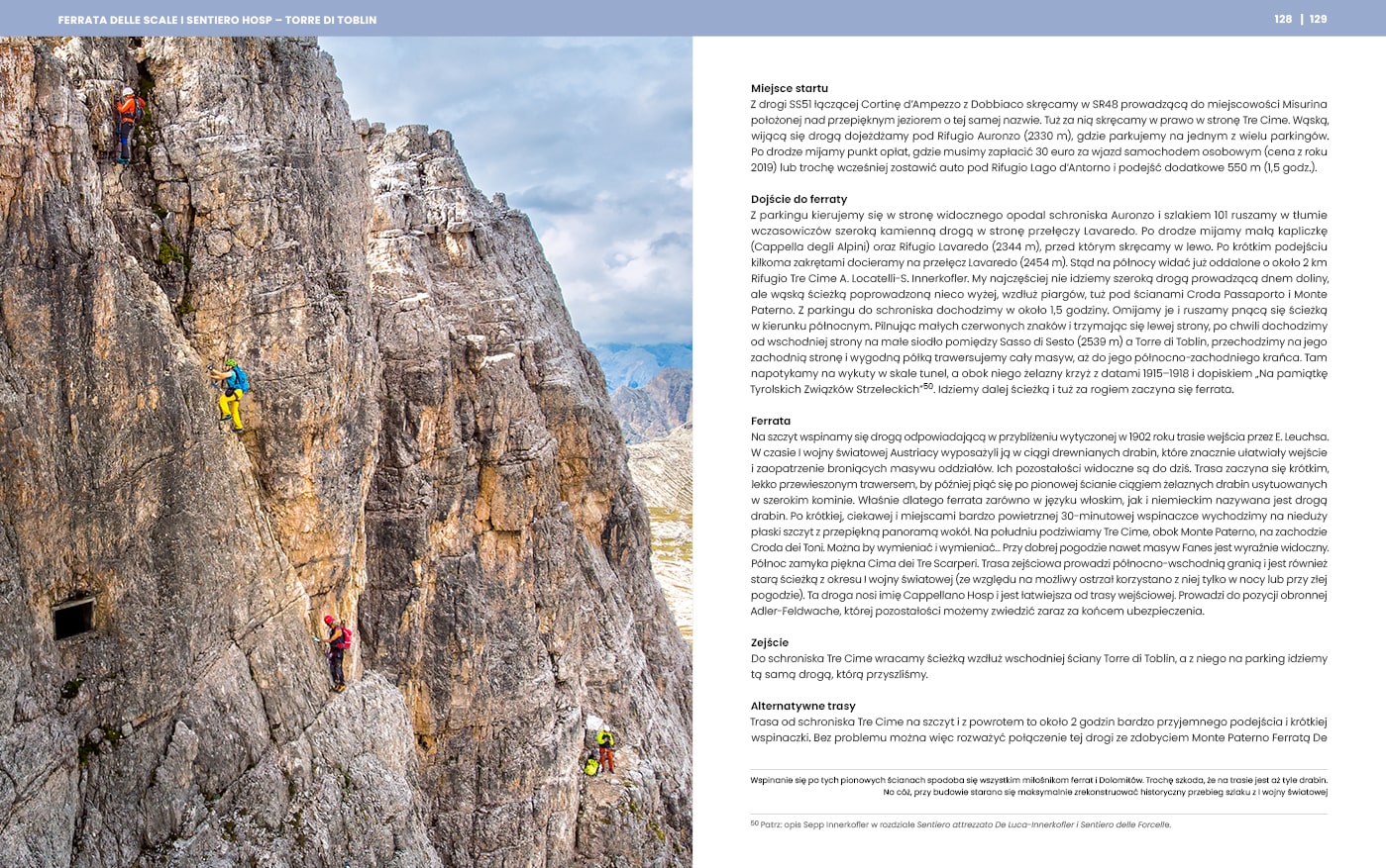 Drugi – Croda Rossa di Sesto, Monte Piana, Monte Popera, Cadini di Misurina, chociaż jest tuż obok, to jest to odludzie, które zionie pustką, a przemierzają je tylko nieliczni. Wymaga dużo więcej: potrzeba siły, miejscami dużo większych umiejętności i przede wszystkim obycia z górami. W zamian jednak oferuje spokój, naturalną dzikość, niesamowitą historię i niepowtarzalnie piękny krajobraz. Sesto jest piękne, zauroczyło nas nie mniej niż nasza ukochana Brenta. Na pewno jest bardziej urozmaicone, bardziej różnorodne, a jednocześnie na pewno nie mniej wspaniałe. To istny raj dla miłośników ferrat, można przez tydzień chodzić nimi od schroniska do schroniska, a do tego przez cały ten czas niemal w samotności podziwiać piękno i dzikość gór. Właśnie dlatego drugi tom opisuje trasy w Sesto. Brakuje tu tras dla początkujących, nawet stosunkowo łatwa na Monte Paterno jest dużo trudniejsza niż jej tunelowy odpowiednik pod Lagazuoi. Obejście Popera jest równie dzikie, długie i wymagające jak trasa wokół Sorapiss, a Ferrata Roghel i Zandonella na pewno nie rozczarują miłośników wspinaczki. Jednak trasy są w większości dużo dłuższe, całodniowe. Tu, poza małymi wyjątkami, raczej nie powiemy – jak w pierwszym tomie – że ferraty są dla każdego, tylko że są dostępne po pewnym przygotowaniu. Chciałoby się powiedzieć, że niektóre opisane tu trasy to ferratowe klasyki i każdy kto jest ich miłośnikiem musi je odwiedzić. Sesto jest inne i wyjątkowe. Serdecznie polecamy ferraty w Dolomitach, szczególnie w regionie Sesto.