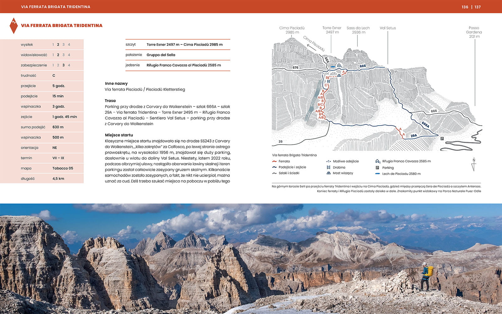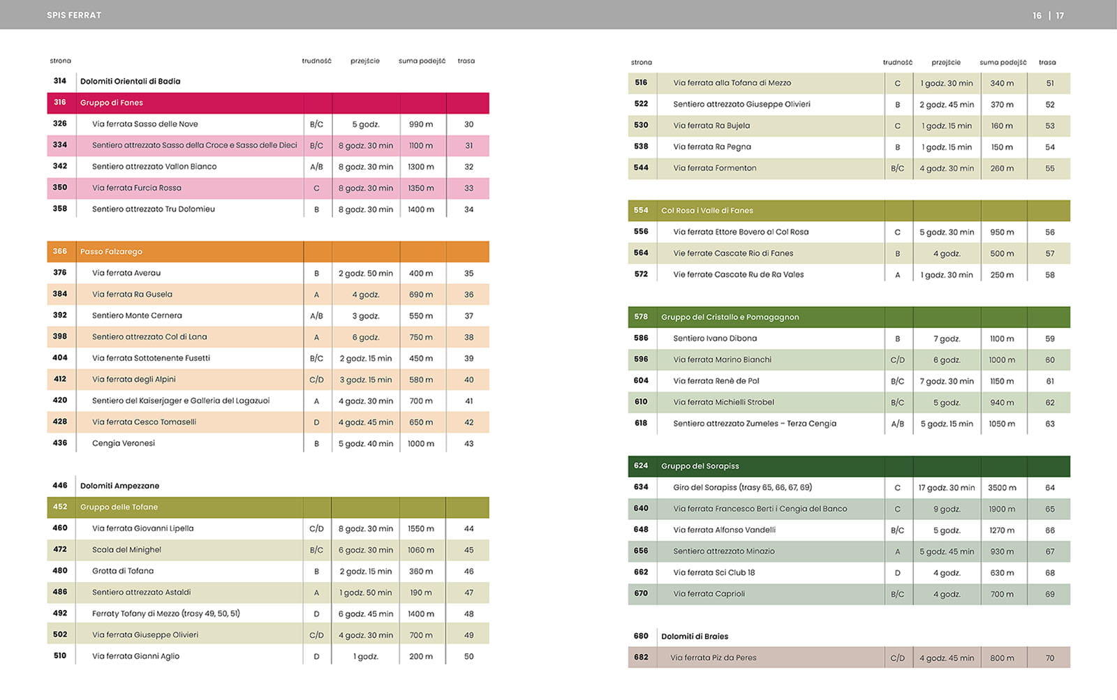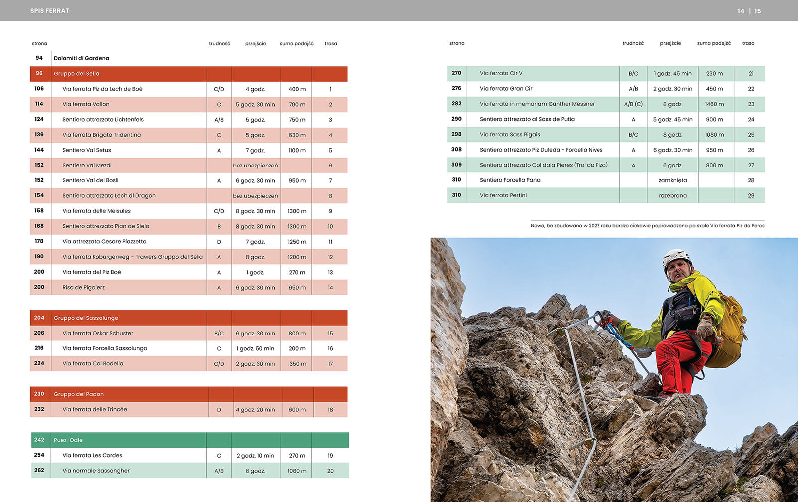 Mapki regionów ułatwiają orientację w terenie, a topo ferrat i wskazówki dojazdu pokazują szczegóły trasy.