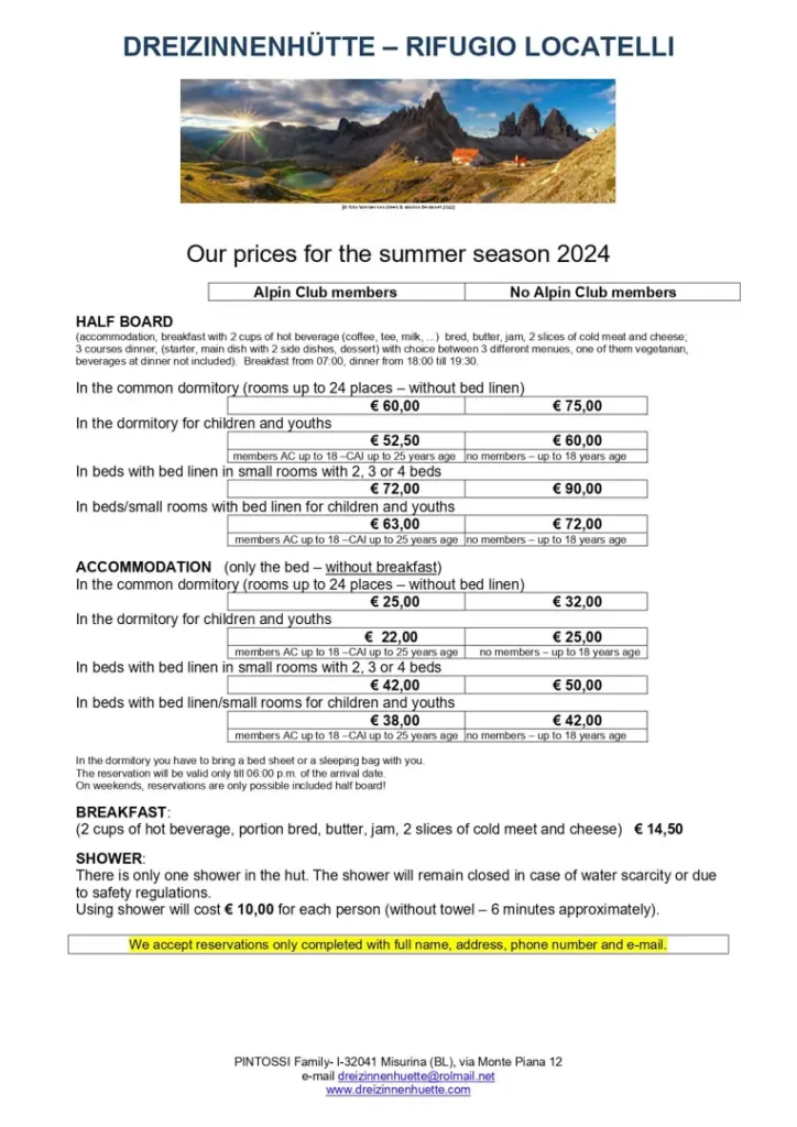 Zobaczcie cennik na 2024 rok w schronisku Locatelli-S. Innerkofler alle Tre Cime (2405 m) (niem. Dreizinnenhütte) – położone w Sesto, tuż obok słynnych Tre Cime i Ferrat na Monte Paterno i Torre di Toblin.